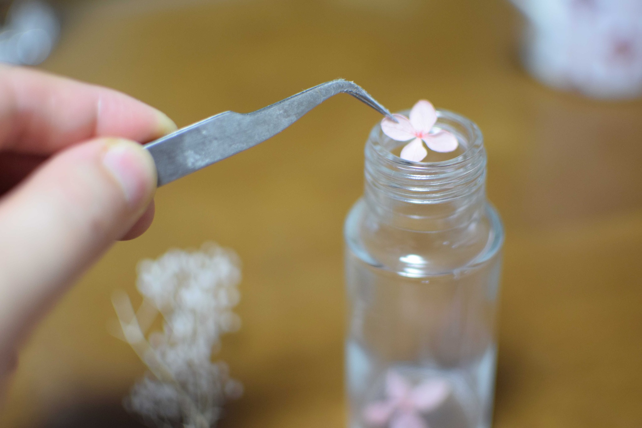 ③アジサイが入ったら、瓶に添わせるようにして、ハーバリウムオイルをゆっくりと注いでいきます。