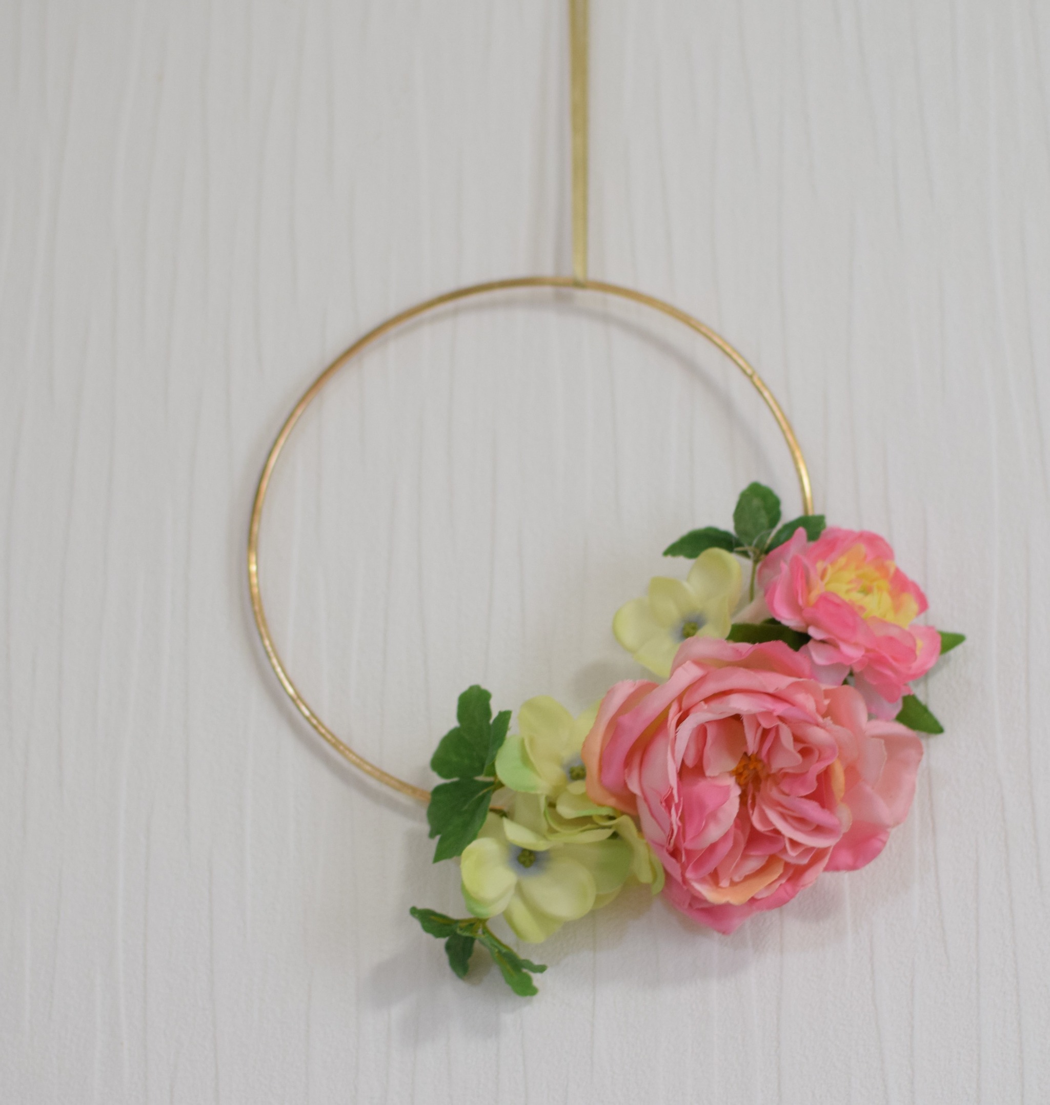 お花を接着して仕上がったら、ゴールドフープに吊り下げ用のリボンを結んで完成です♪