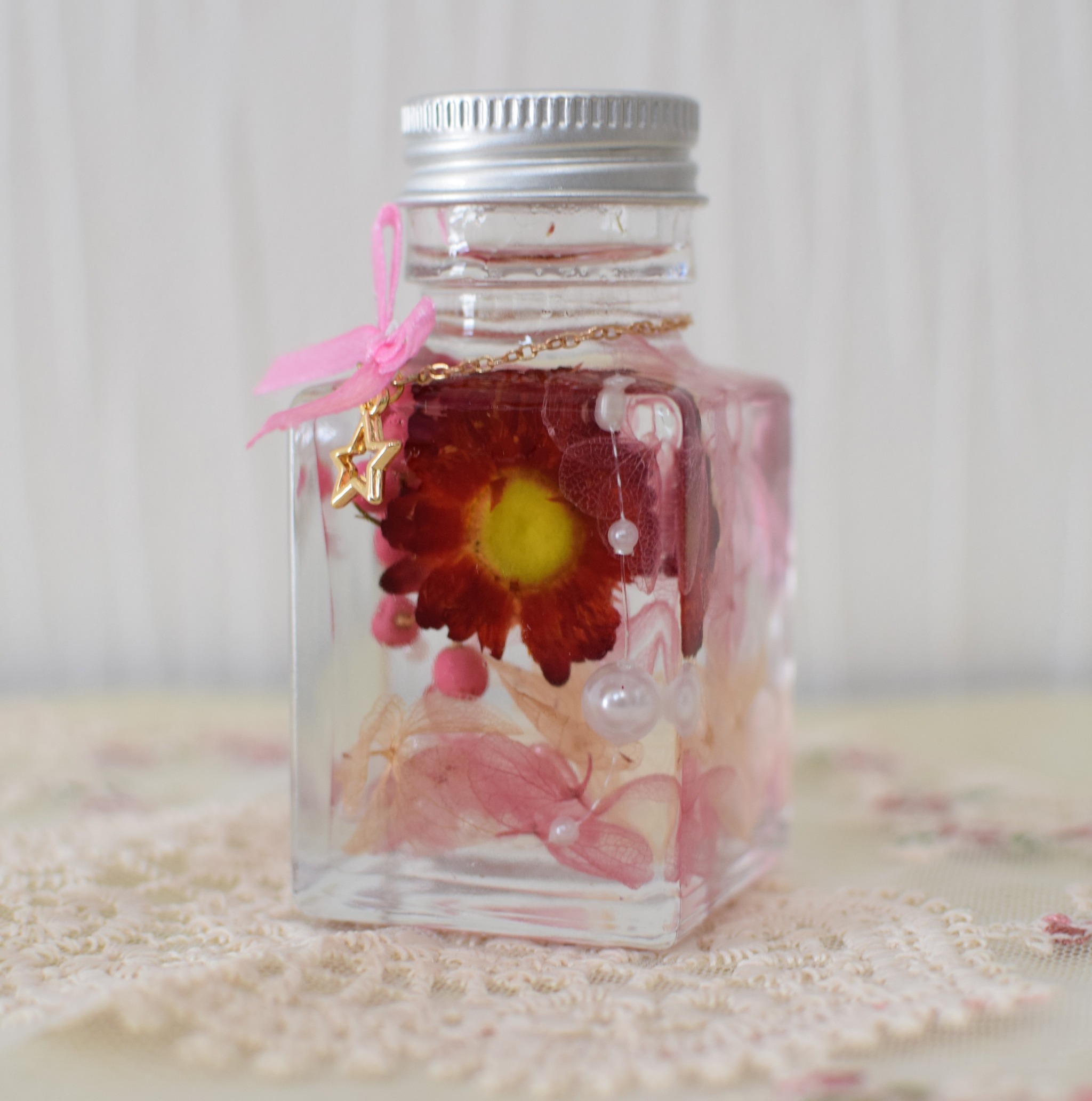 ⑤最後にお花の位置を調整して、ボトルいっぱいにオイルを注いで出来上がりです。
