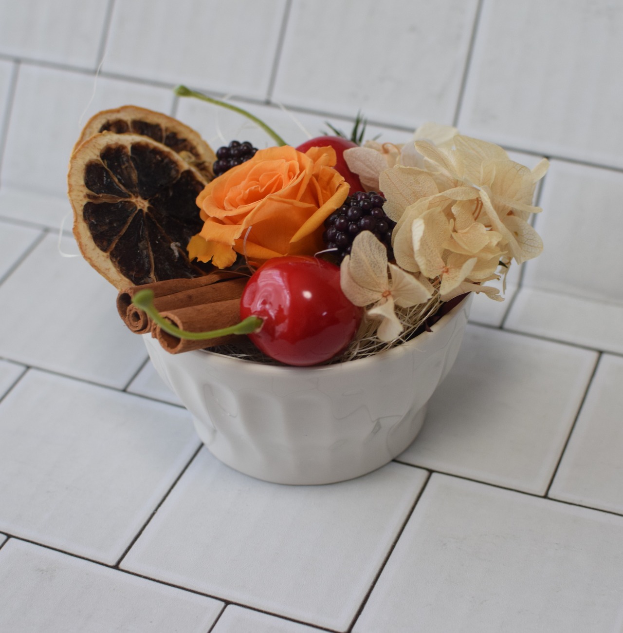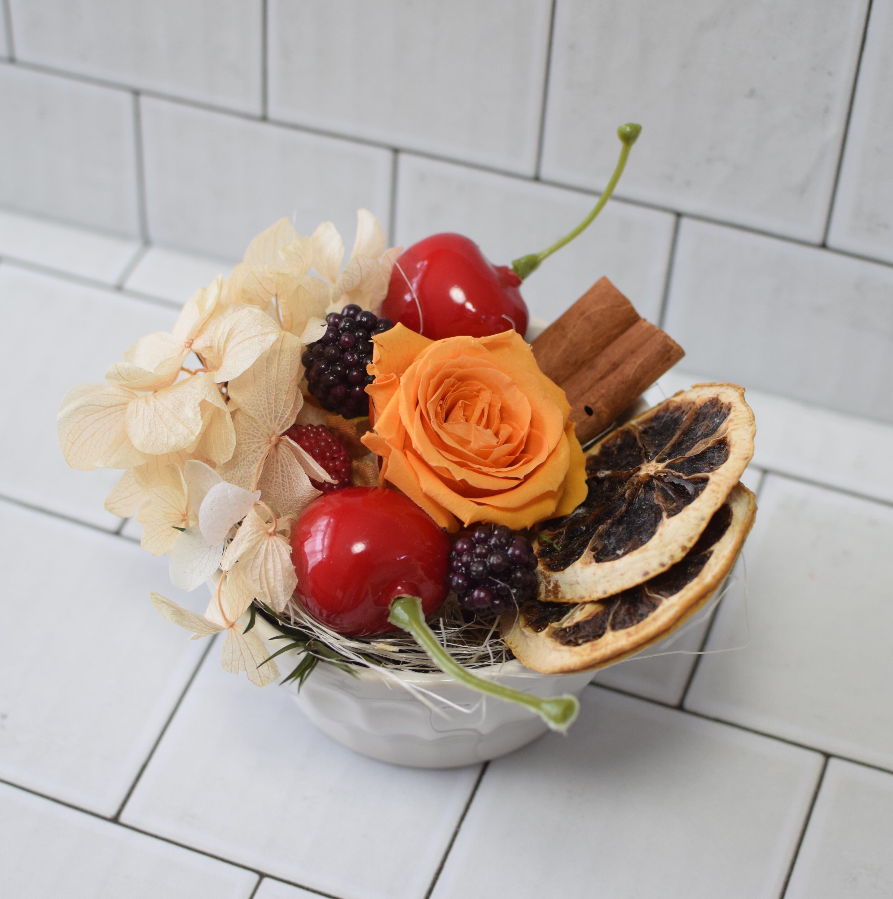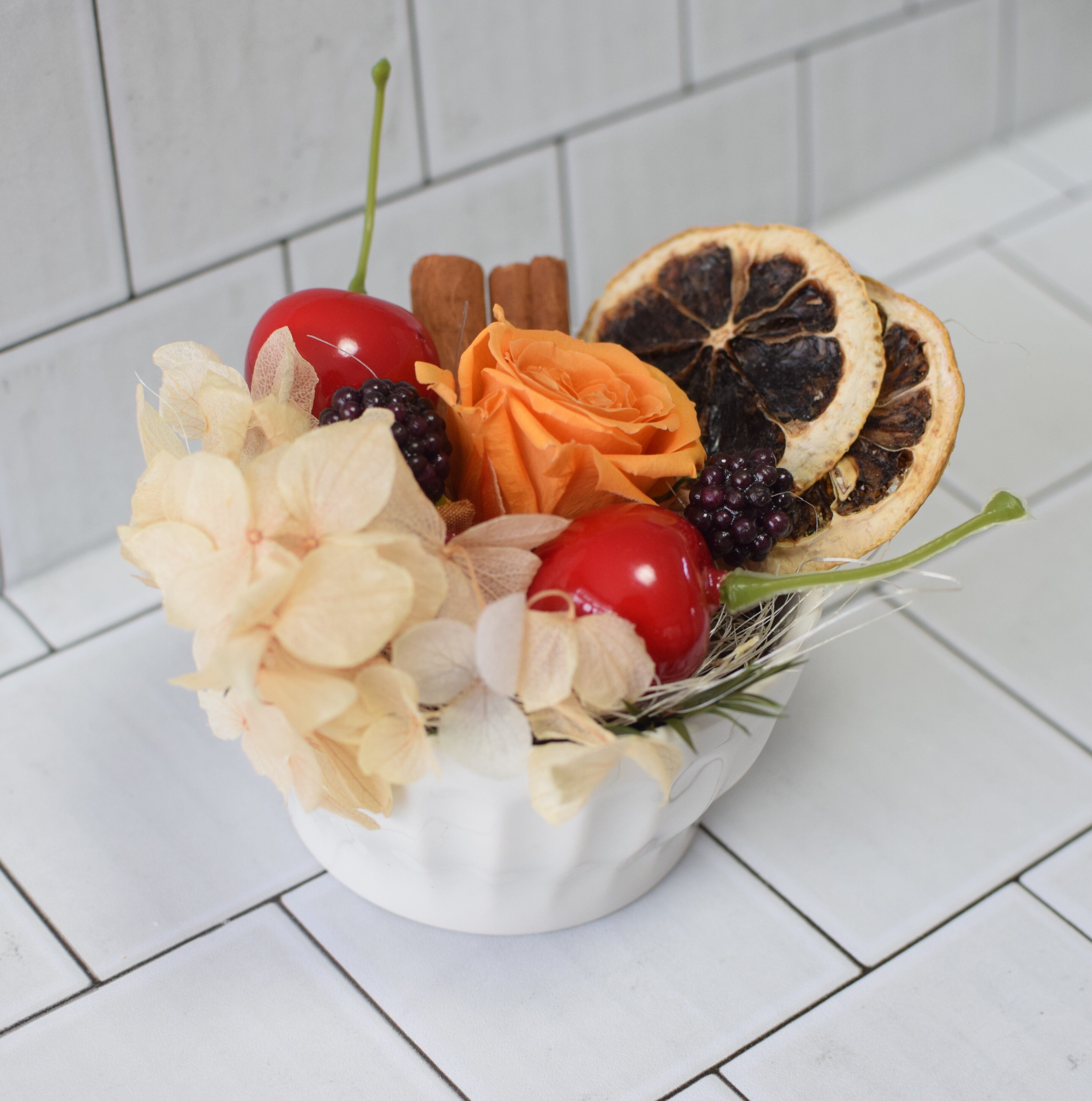 陶器の白い器に、プリザーブドフラワーのアジサイや、オレンジ、シナモン、造花のチェリーやベリーをのせて、美味しそうなお花のケーキに仕立てました。