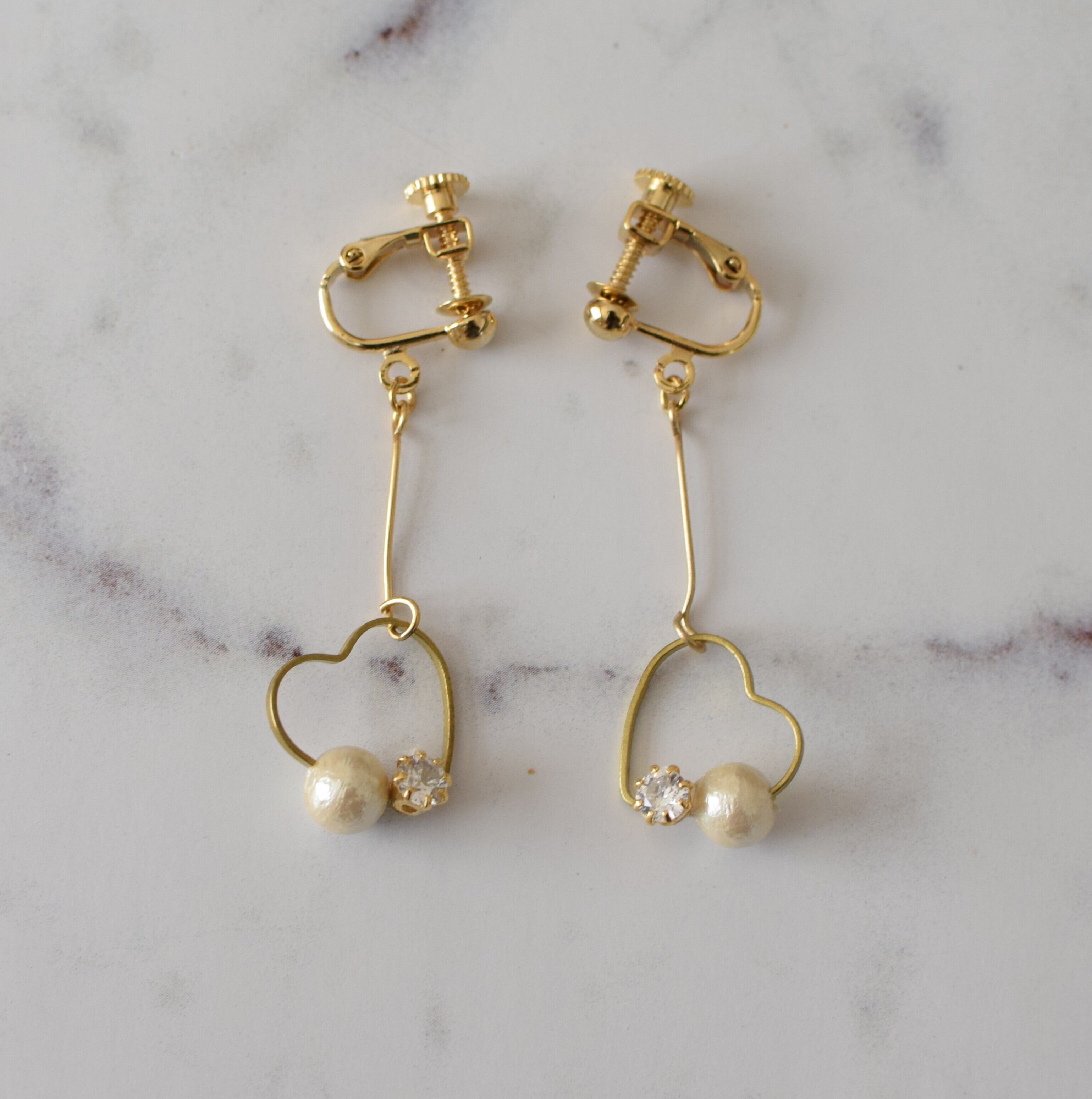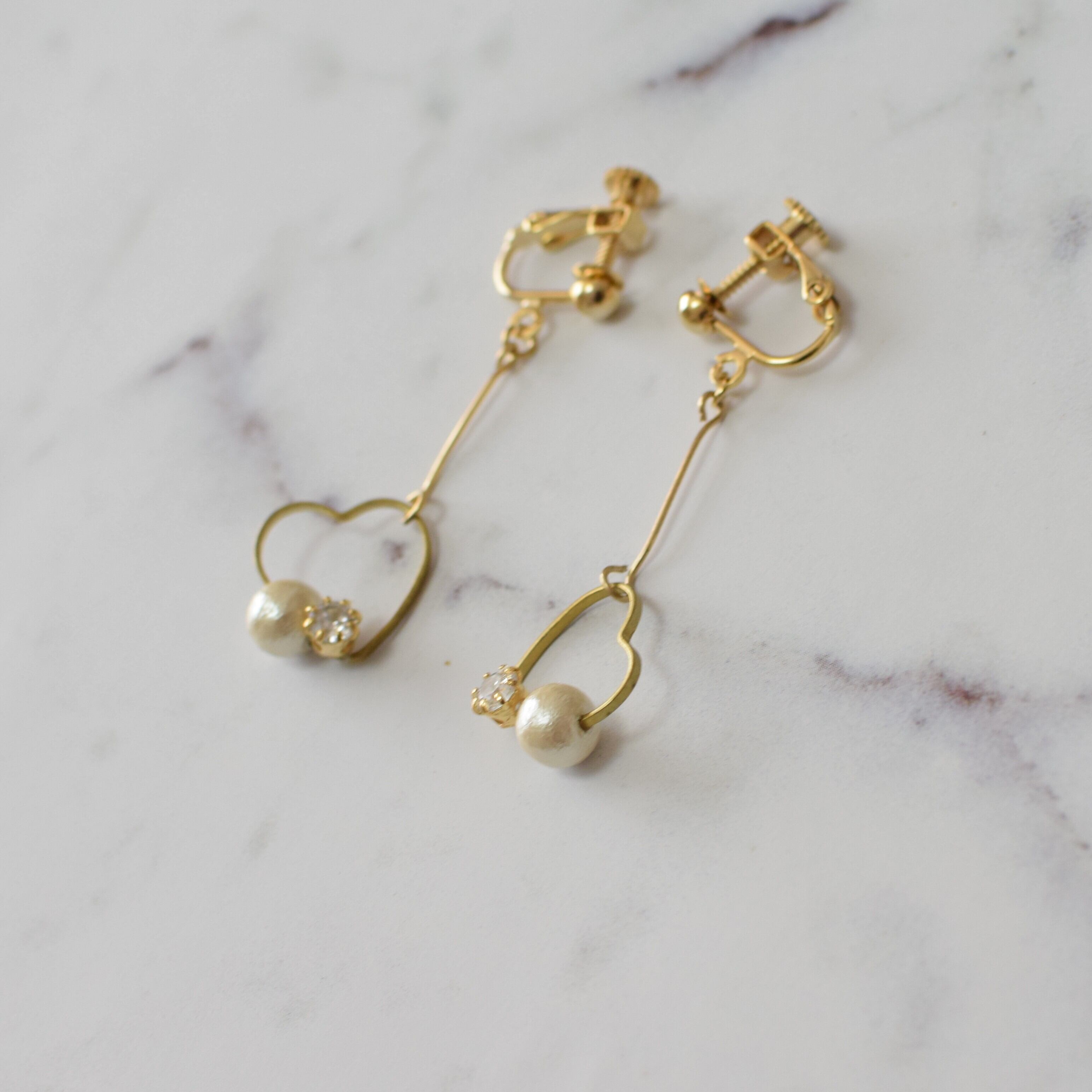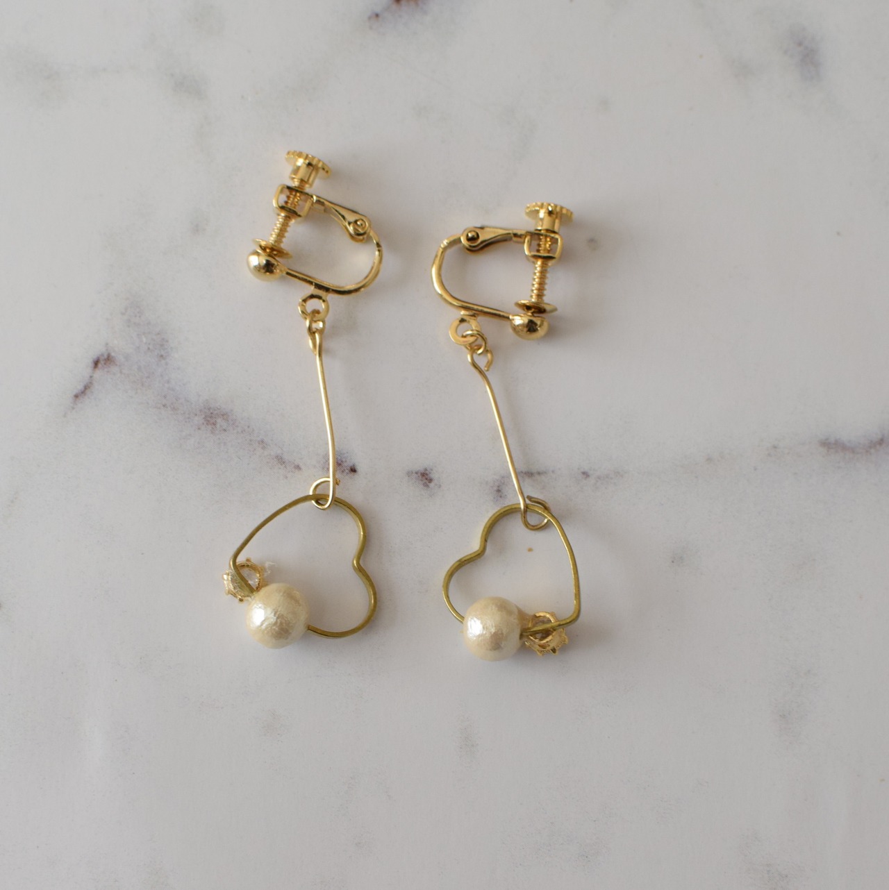 #ワイヤー #ハート #ロングイヤリング #ハンドメイド #ネジばね式 #ゴールドカラー #ギフトラッピング #コットンパール #キュービック
