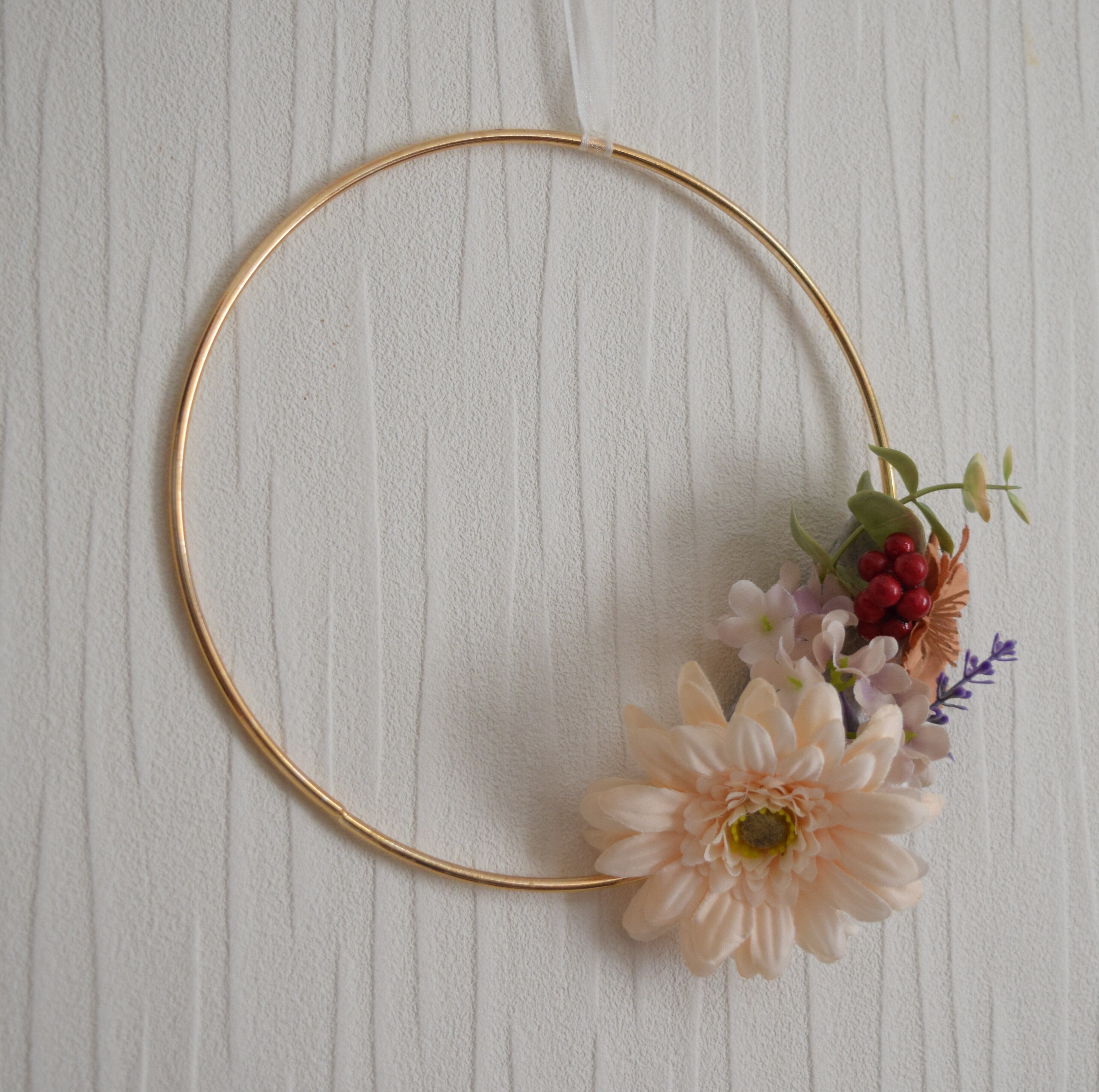丈夫なゴールドフープに造花をあしらっていますので、玄関に飾るのもおすすめです。
