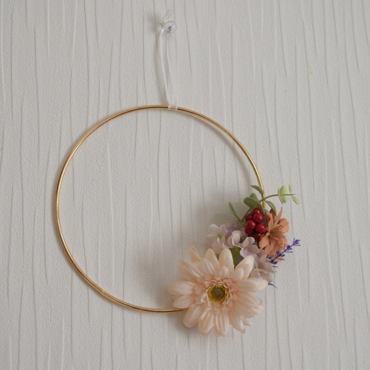 お洒落なゴールドフープに、クリーム色のガーベラを中心にしたリースを仕立てました。