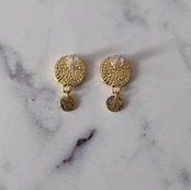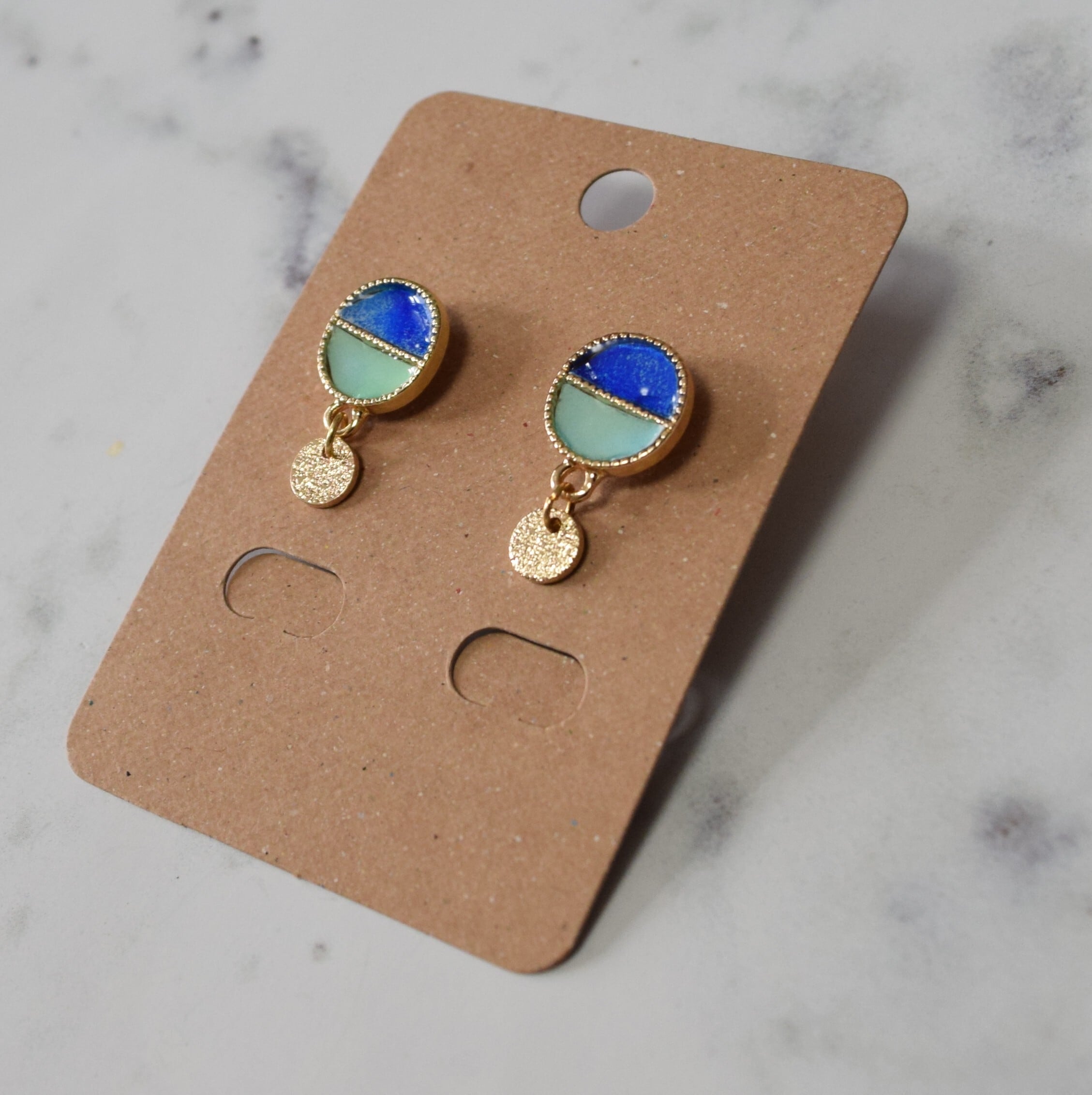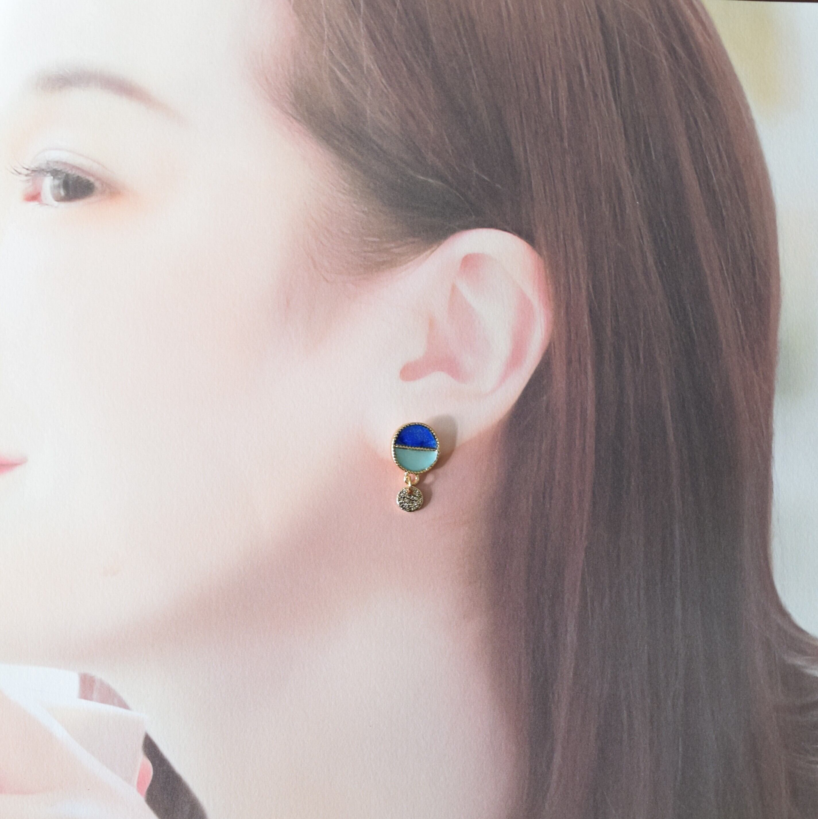 ブルーとグリーンで描いたアルコールインクアートを使って、ラウンド・ピアスに仕上げました。