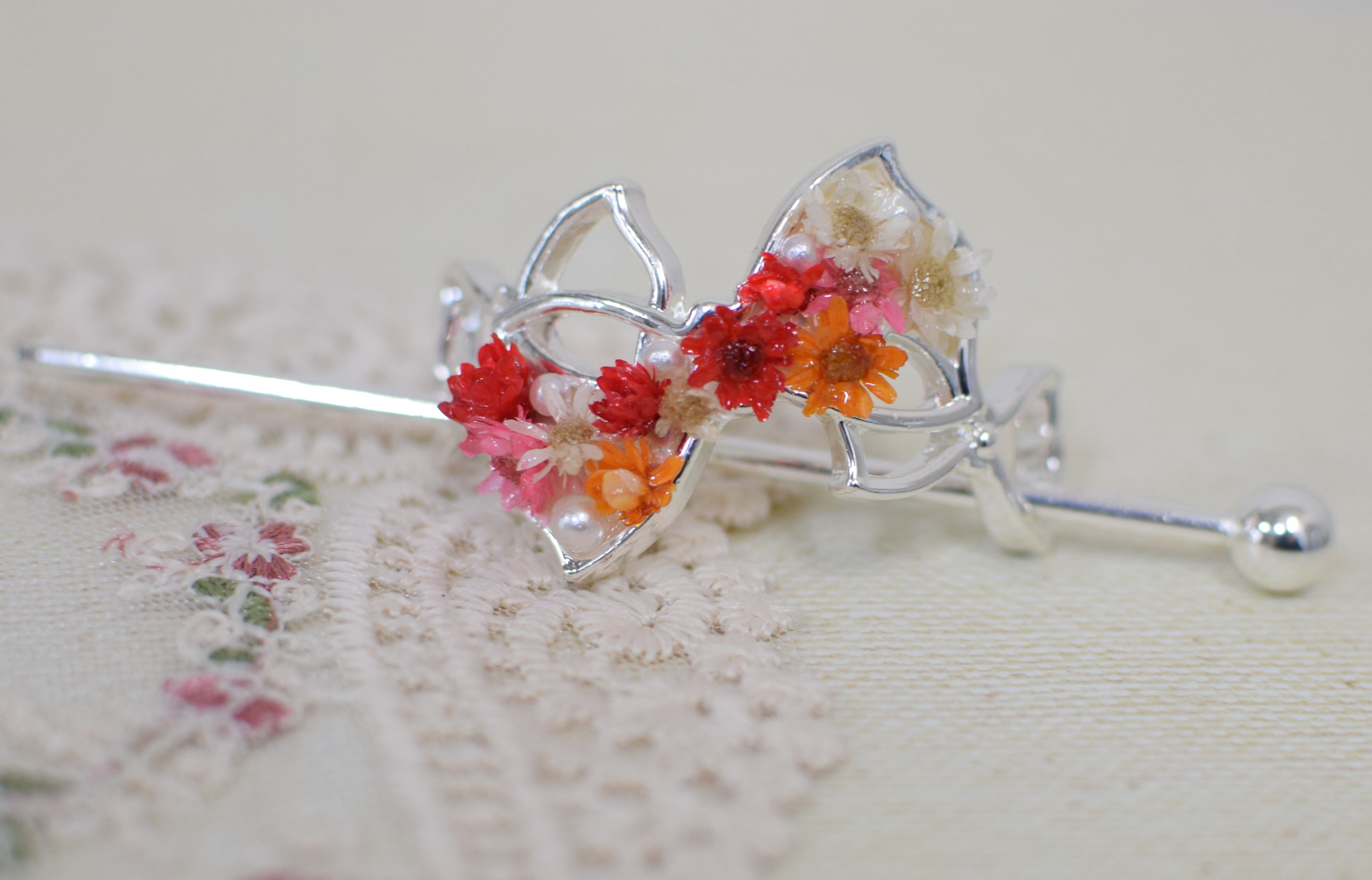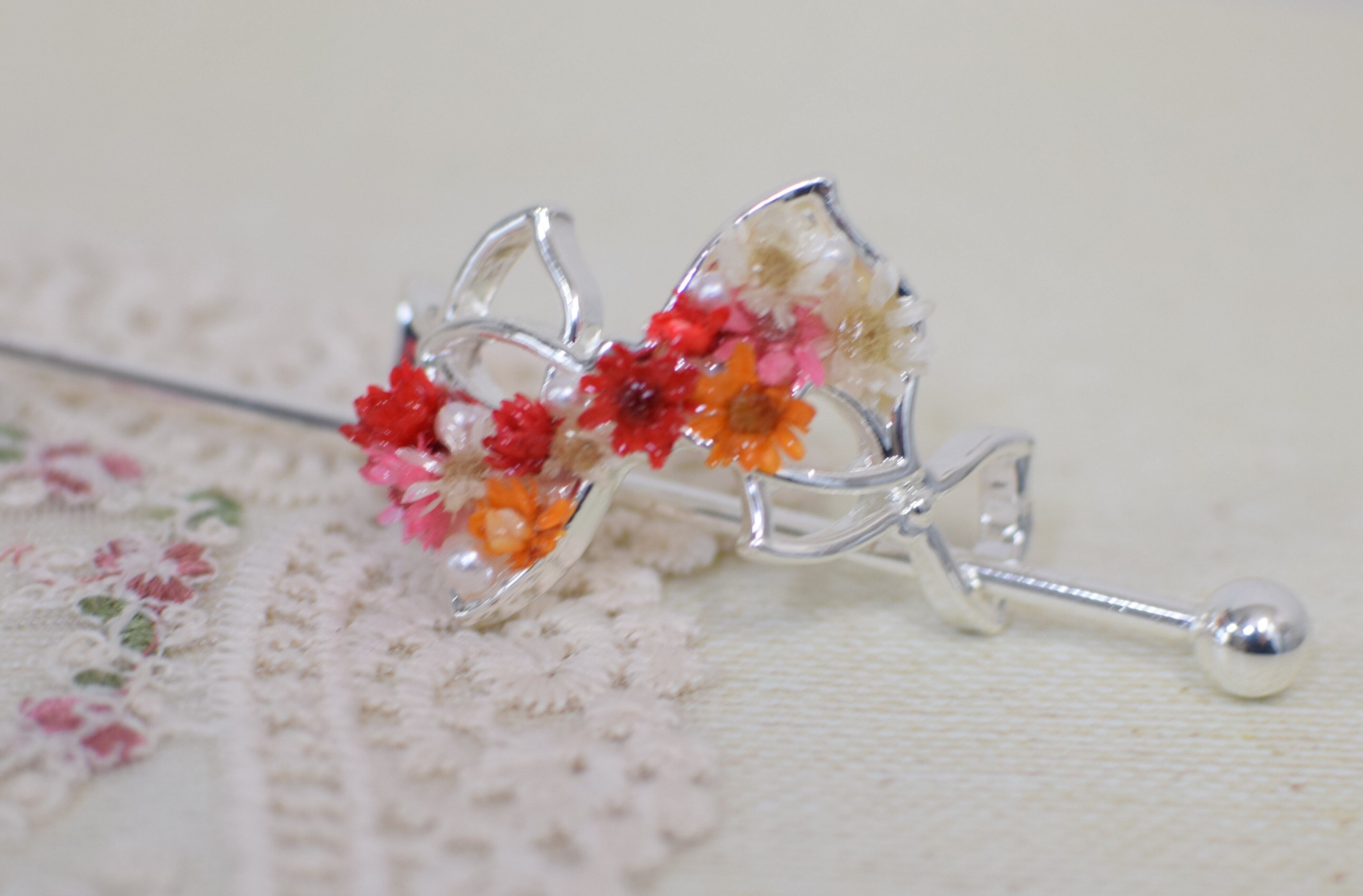 リボンのフラワーかんざしは、プリザーブドフラワーのカスミソウの花をコーティングしており、鮮やかな色合いが目を引きます。カラフルなカスミソウを敷き詰めた華やかな装飾で、ヘアアレンジやファッションコーディネートにアクセントをプラスしてくれます。お祭りやパーティーなどの特別な場面にもぴったりのアイテムです。