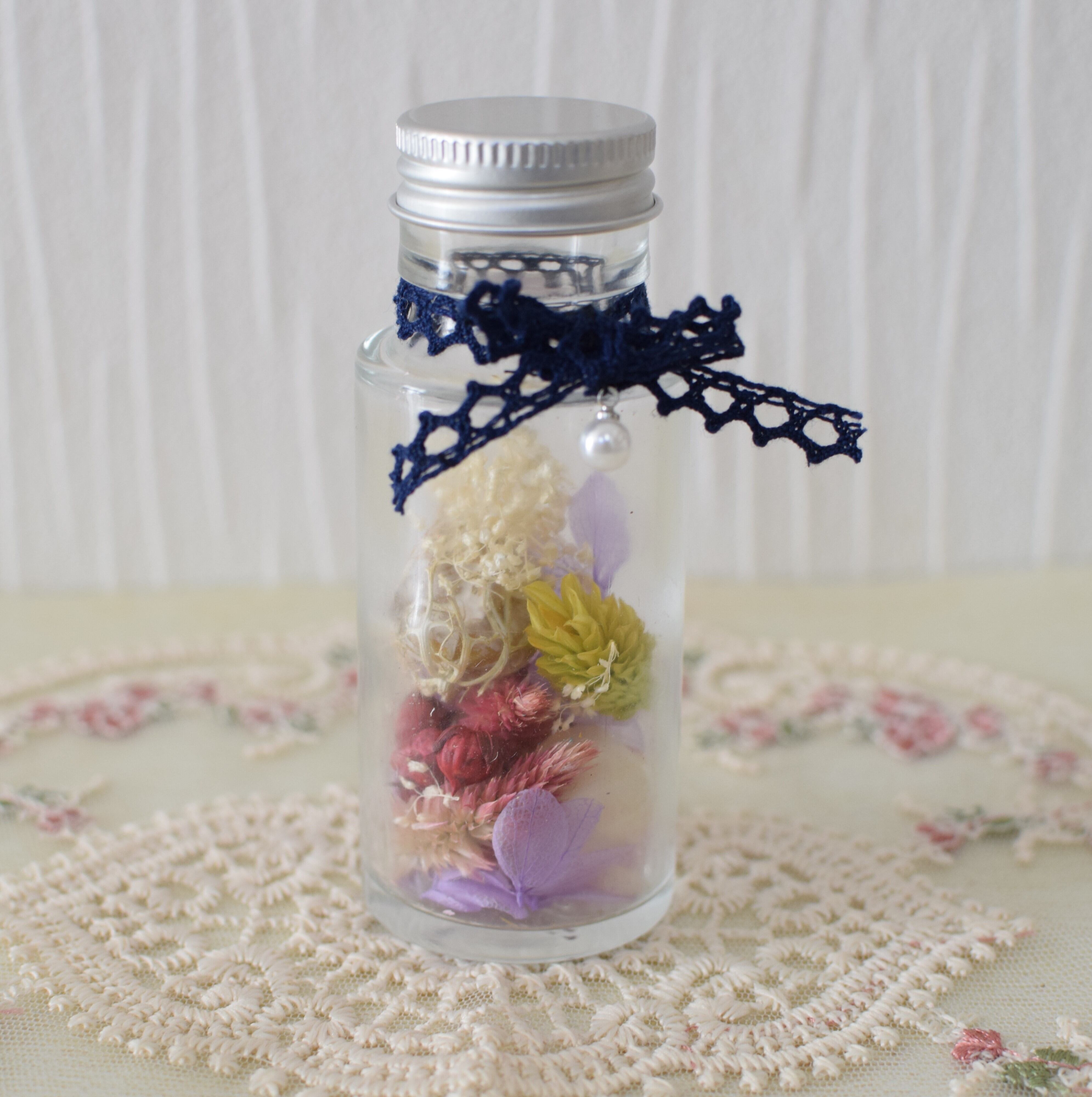 ミニボトルフラワーは、カラフルなプリザーブドフラワー・ドライフラワーが色々な角度からお楽しみいただけます。
