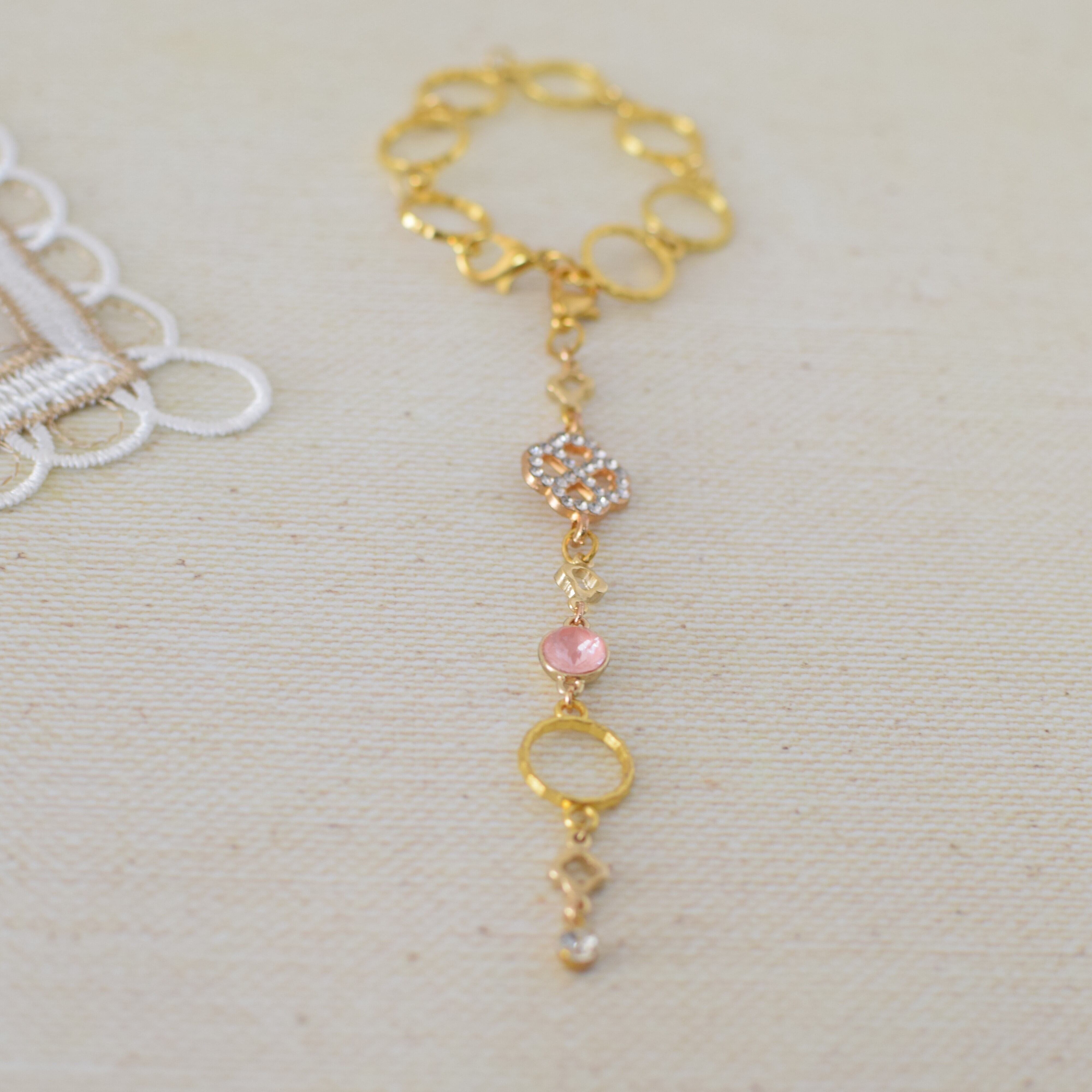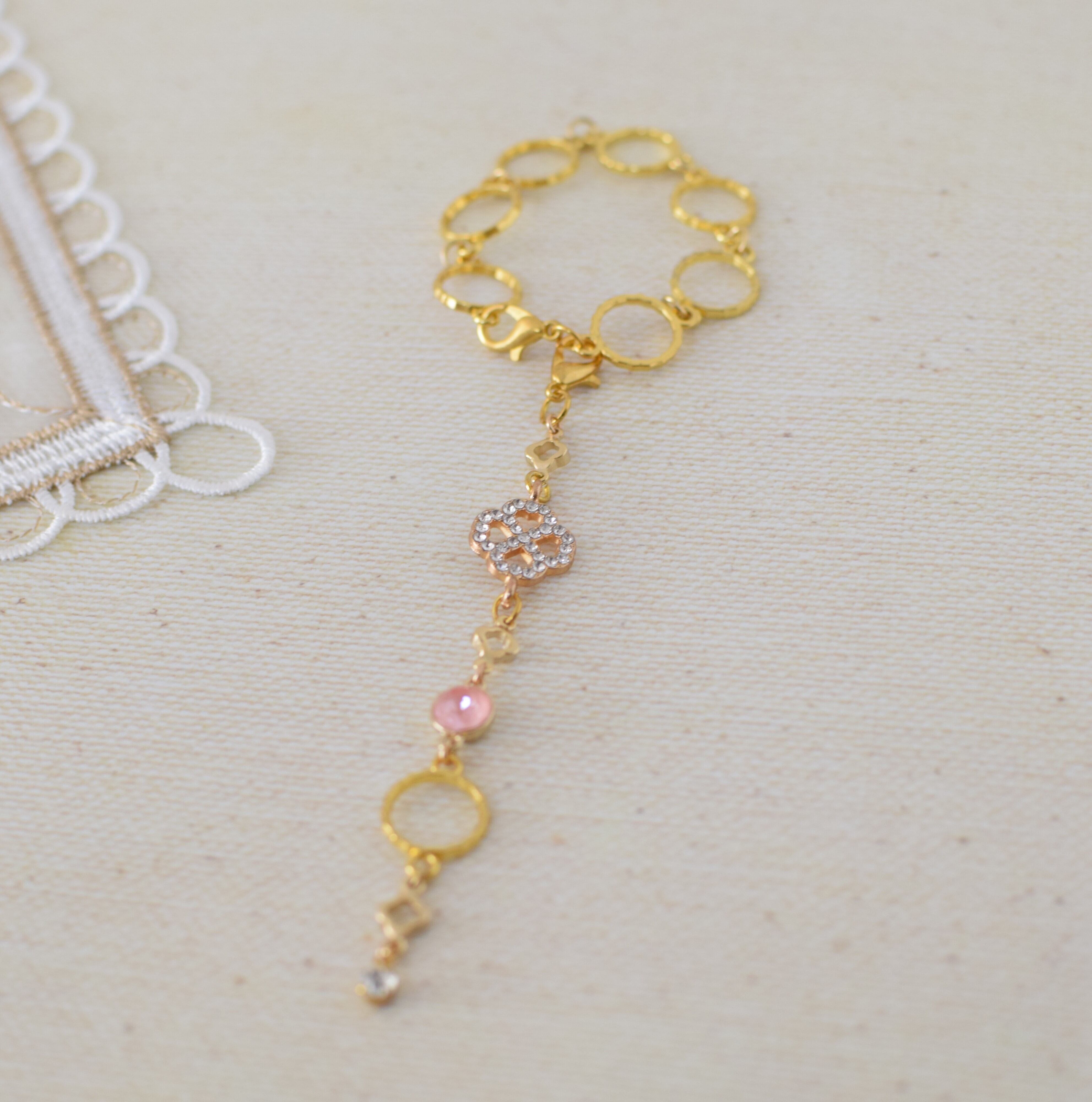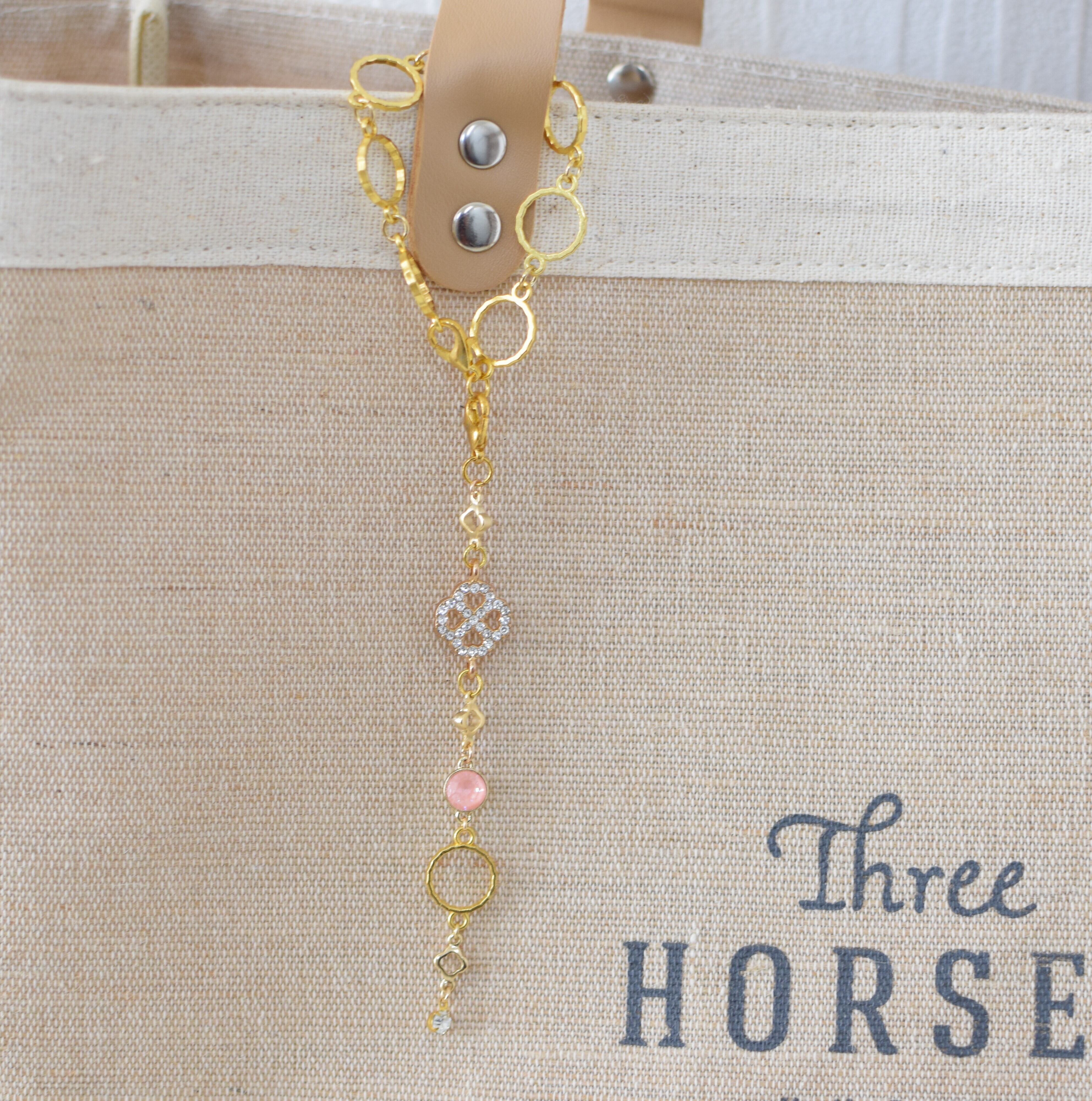 クローバーやピンクのガラスチャームが、バッグにキラキラと輝きます。