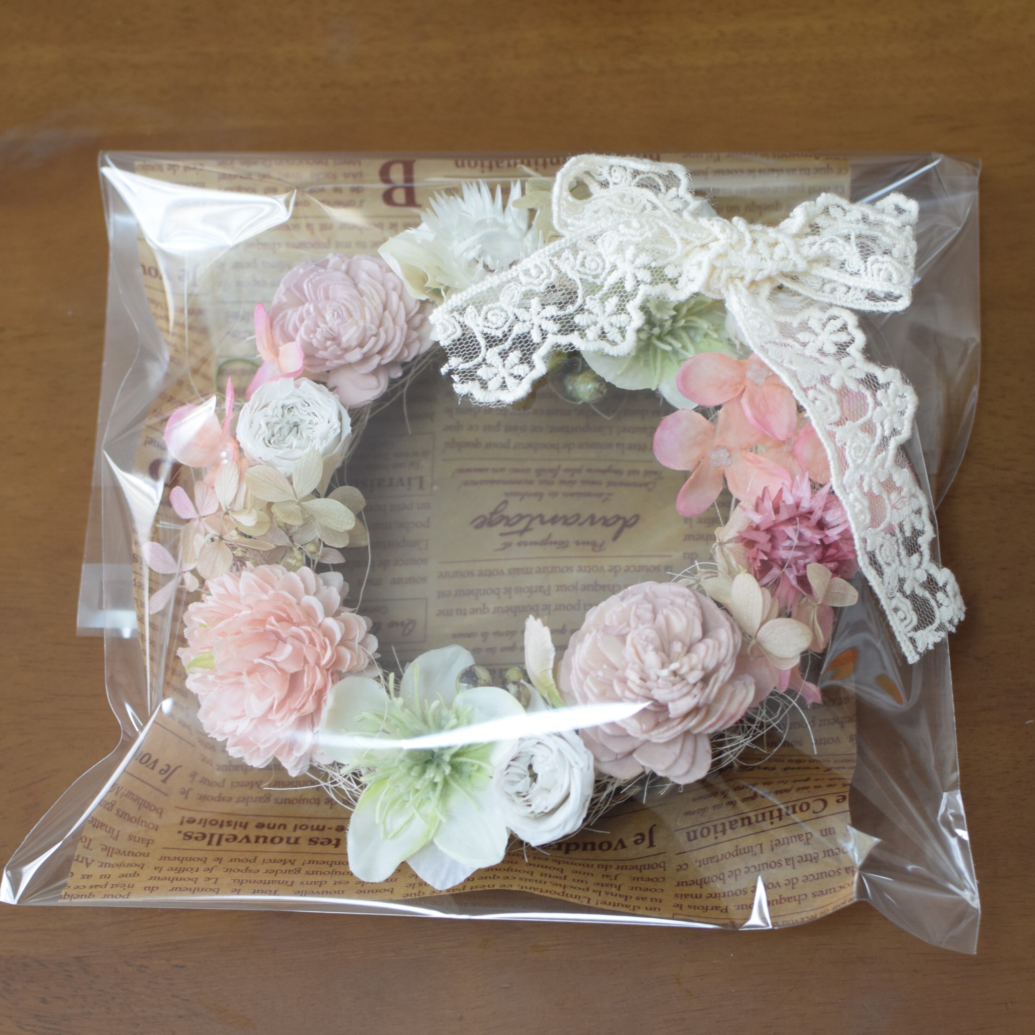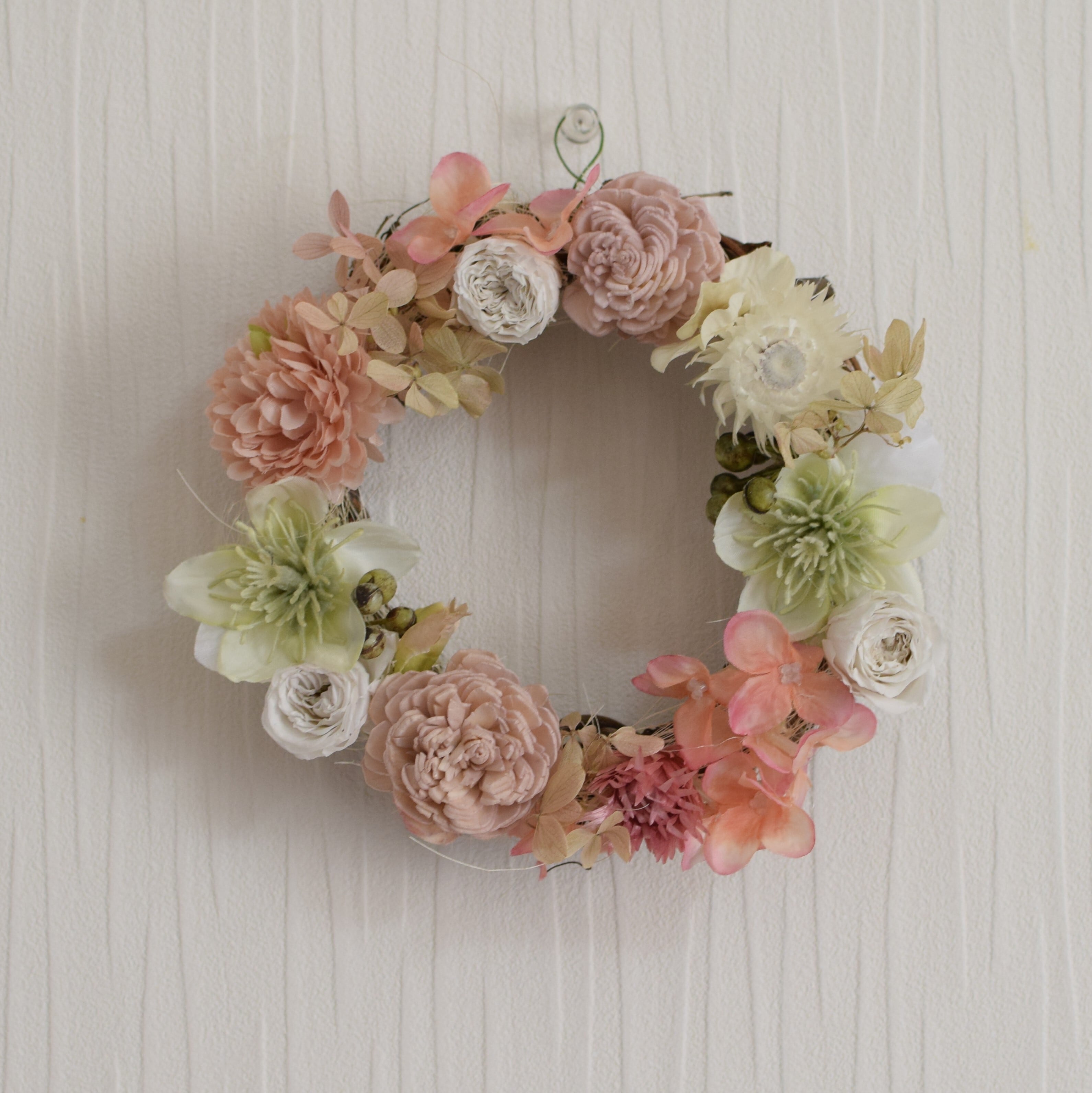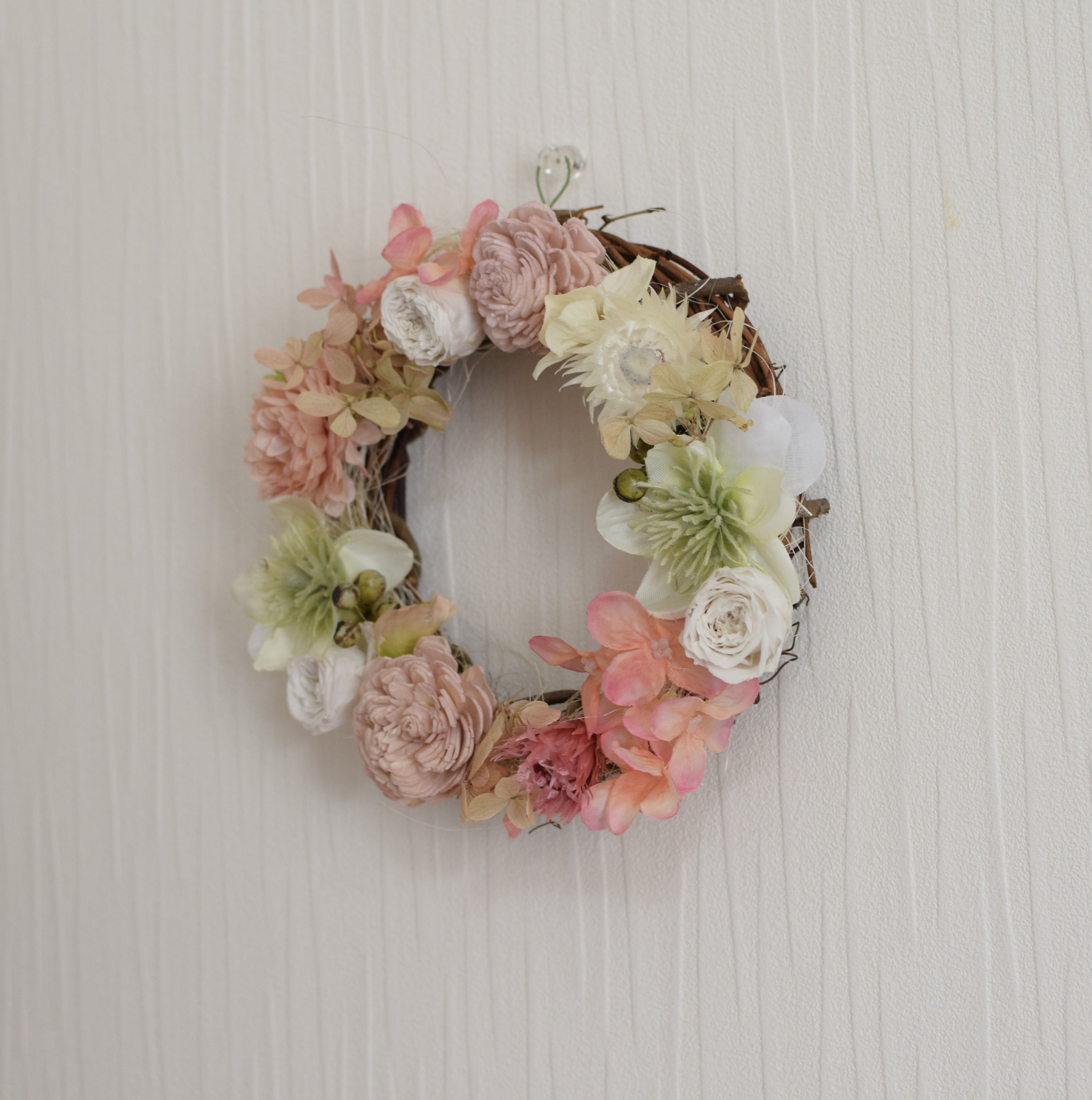 ピンク、ホワイト、グリーンのお花で囲まれた壁かけ用のリースです。