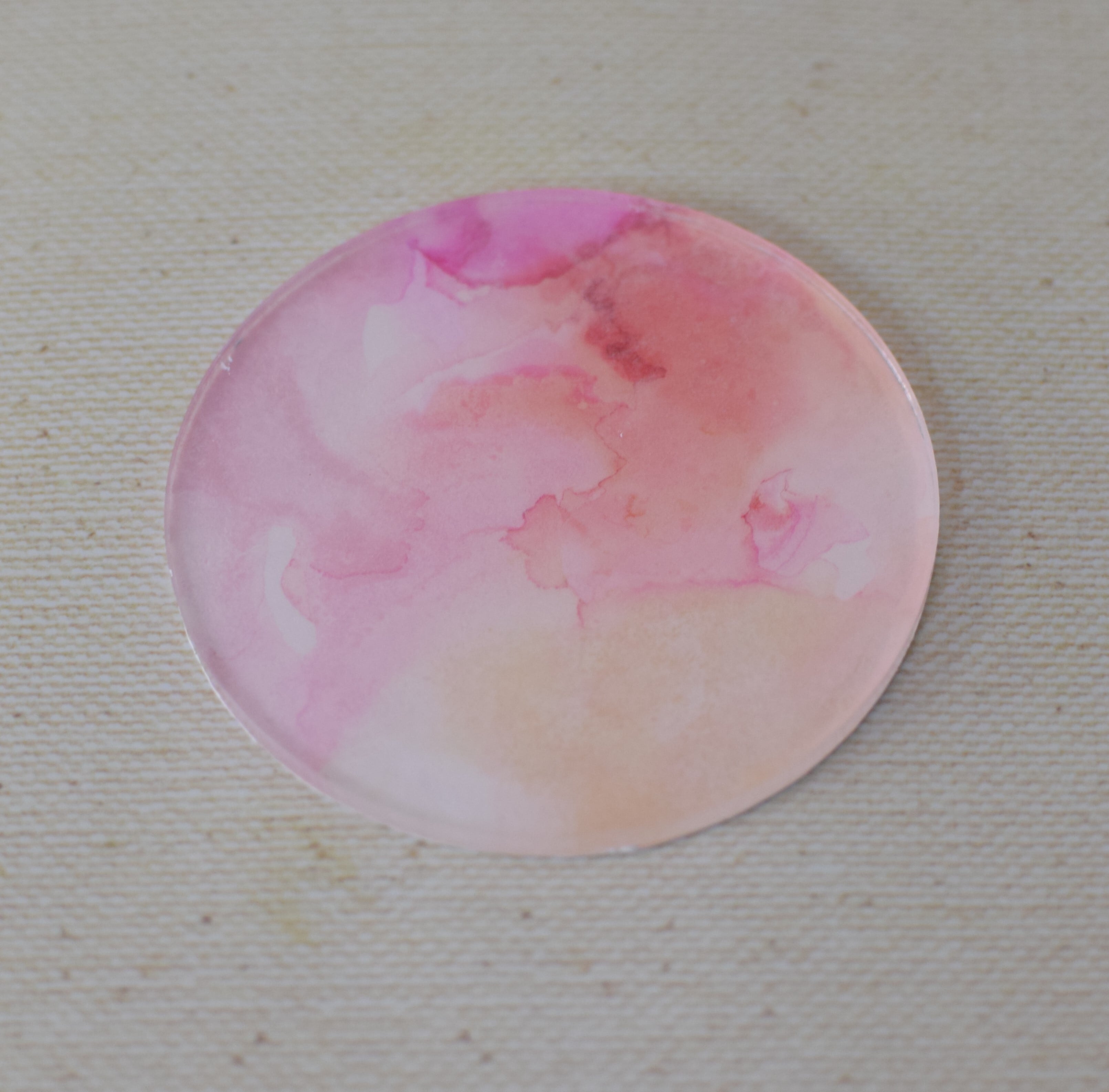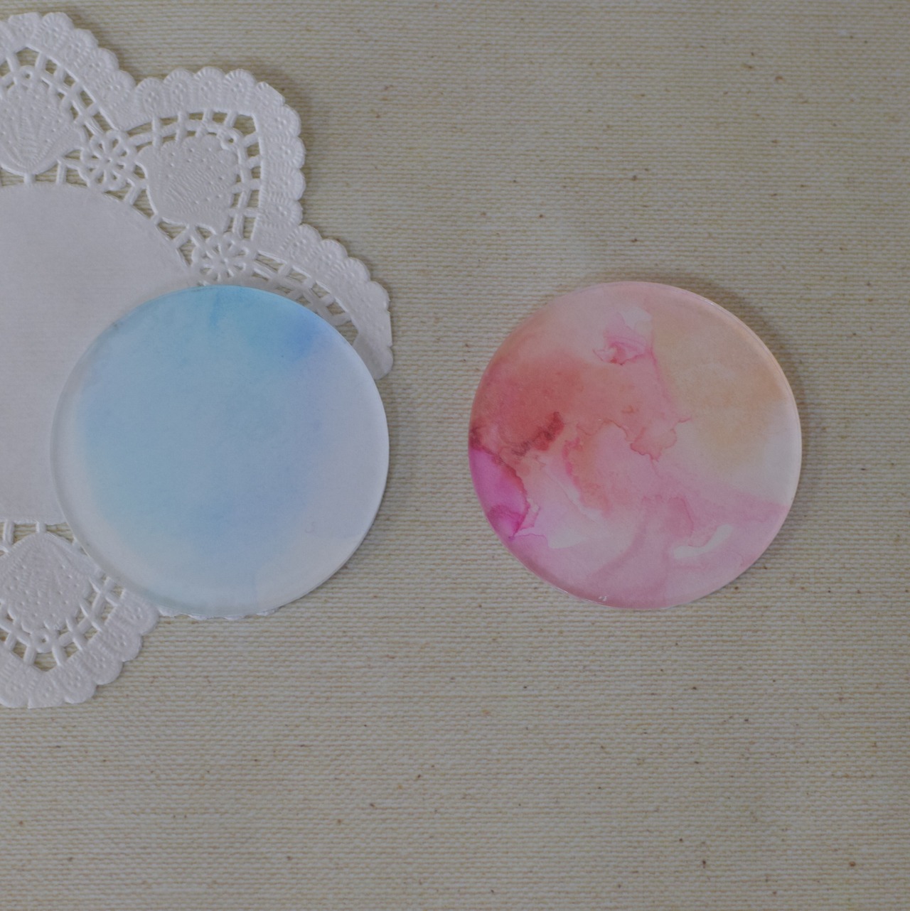 一つはブルーのインクを使って描いたグラデーションの色模様、もう一つはピンクとゴールドのインクを使ったニュアンスアートのコースターです。
